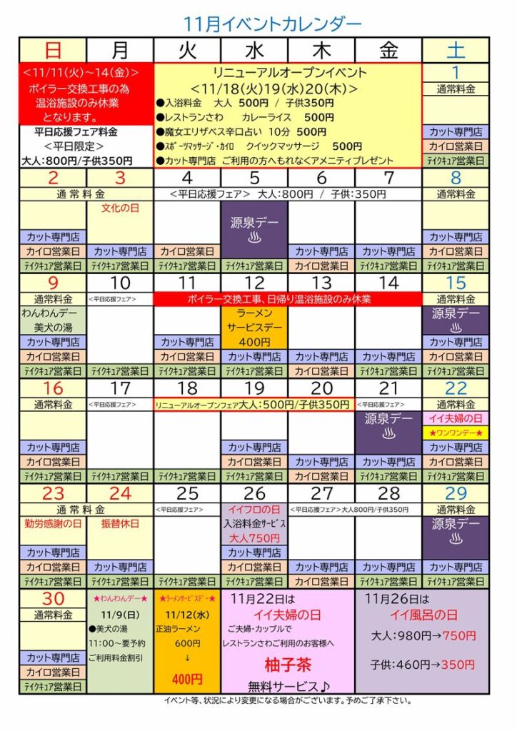 次の週の11/18(火)~20(木)の3日間はリニューアルオープンフェアを開催!さらに快適になった天然温泉をぜひお楽しみください。
